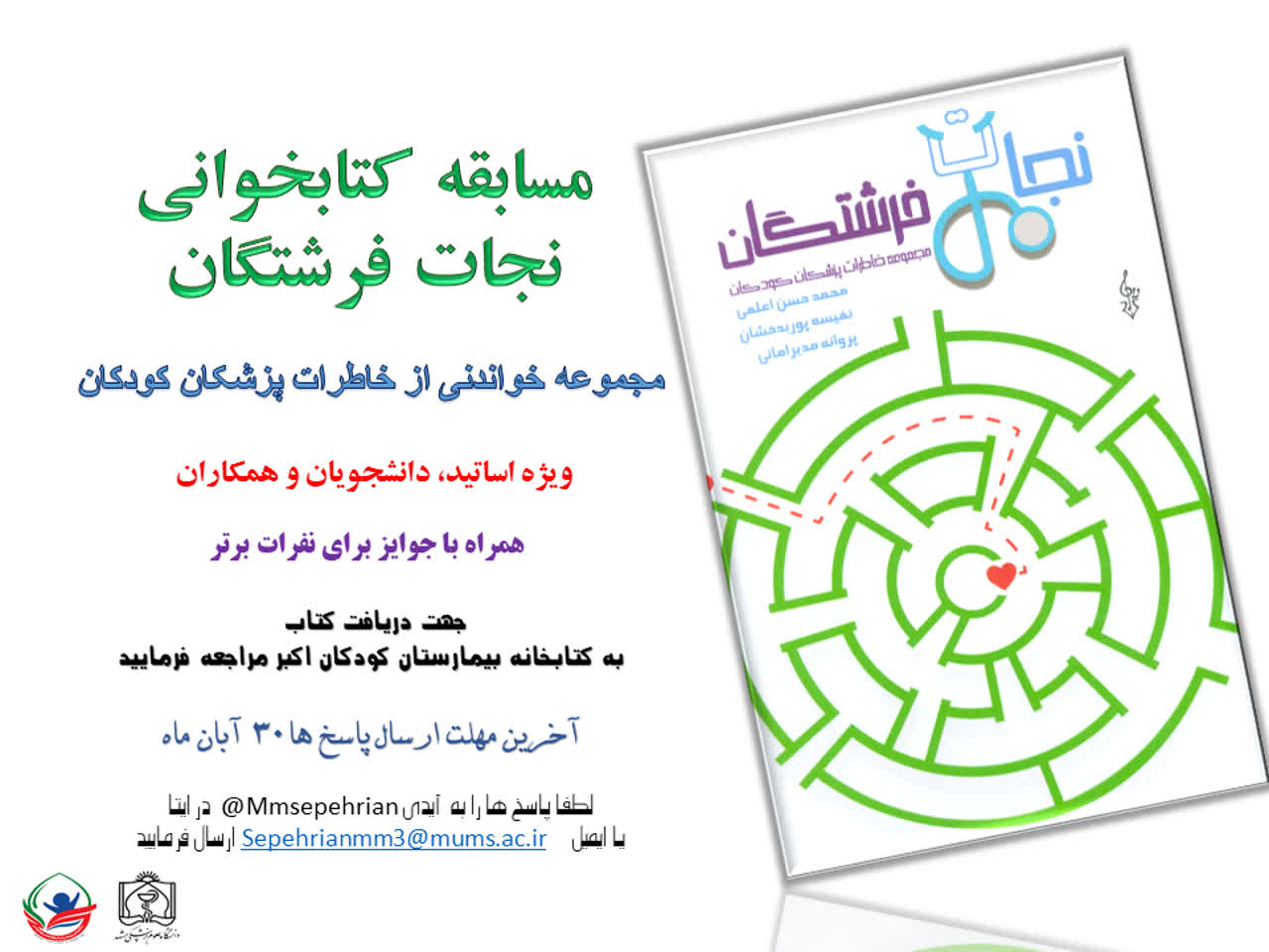 به گزارش واحد روابط عمومی بیمارستان فوق تخصصی کودکان اکبر به مناسبت هفته کتاب و کتاب خوانی معاونت آموزش و سلامت بیمارستان مسابقه کتاب خوانی کتاب نجات فرشتگان را برگزار می نماید. از این رو مجموعه معاونت آموزش و سلامت مرکز به مناسبت هفته کتاب و کتابخوانی، شما را به شرکت در مسابقهای جذاب و هیجانانگیز از کتاب آموزنده و دلنشین «نجات فرشتگان» دعوت میکند. این اثر ارزشمند شامل مجموعهای از خاطرات پزشکان متخصص کودکان است که با تلاشهای ارزنده دکتر محمدحسن اعلمی، دکتر پوربدخشان و پروانه مدیر امانی، از اساتید برجسته و همکاران گرامی دانشگاه علوم پزشکی مشهد، گردآوری شده است. لازم به ذکر است جهت اخد کتاب الکترونیک و سوال های آن به واحد کتابخانه و یا روابط عمومی مراجعه نمائید. همچنین می توانید با عضویت در کانال ایتای بیمارستان دسترسی مستقیم به کتاب الکترونیکی و سوالات آن داشته باشید. |