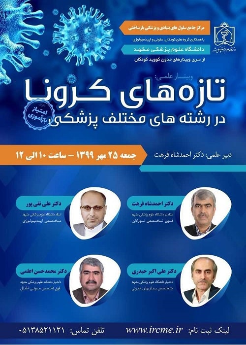 وبینار علمی تازه های کرونا در رشته های مختلف پزشکی به همت مرکز جامع سلول های بنیادی و پزشکی بازساختی دانشگاه علوم پزشکی مشهد برگزار می شود.