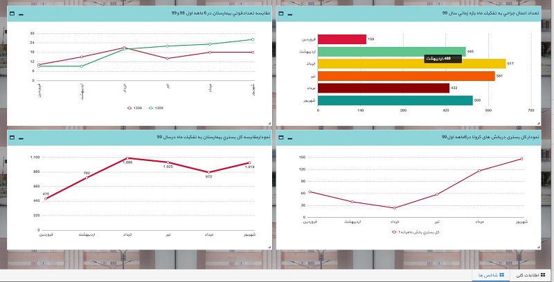 مسئول واحد فناوری اطلاعات سلامت افزود: داشبورد بیمارستان کودکان اکبر شامل نمودارهای گرافیکی شاخص های بیمارستان در۶ ماهه اول ٩٩ درشرایط کرونا وتاثیری که کرونا برآن گذاشته است را به نمایش میگذارد.