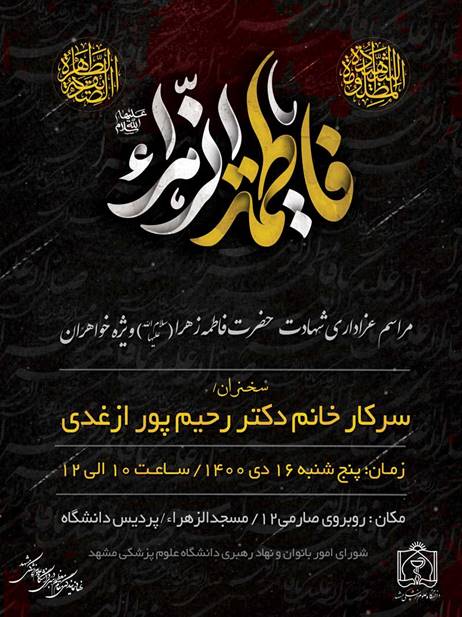به اطلاع عاشقان اهل بیت(ع) می رساند، مراسم عزاداری شهادت حضرت فاطمه سلام الله علیها -ویژه خواهران- برگزار می گردد. با سخرانی سرکارخانم دکتر رحیم پور ازغدی