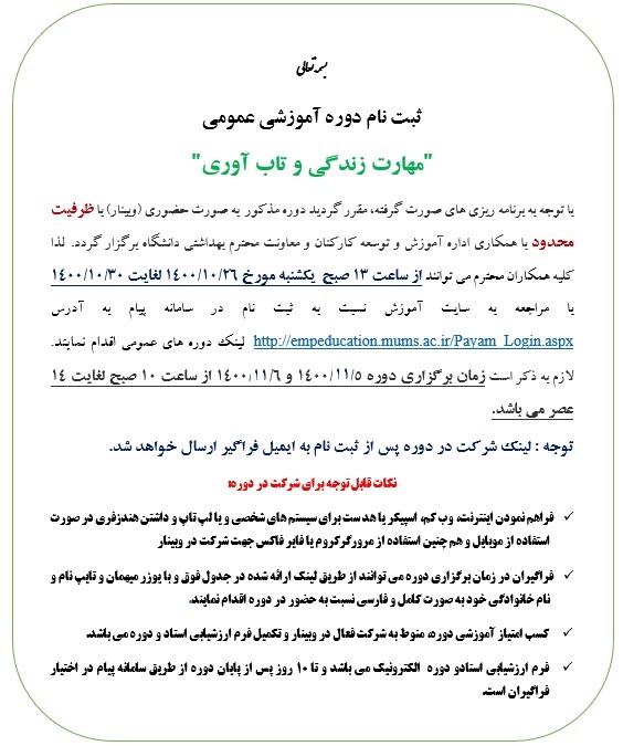 ثبت نام دوره آموزش عمومی «مهارت زندگی و تاب آوری» با توجه به برنامه ریزی های صورت گرفته، مقرر گردید دوره «مهارت زندگی و تاب آوری» به صورت حضوری (ویبینار) با ظرفیت محدود با همکاری اداره آموزش و توسعه کارکنان و معاونت محترم بهداشتی دانشگاه برگزار گردد. کلیه همکاران محترم می توانند از ساعت 13 روز یکشنبه مورخه 26/ 10 لغایت 30/ 10/ 1400 با مراجعه به سامانه پیام و لینک دروس عمومی اقدام نمایند. لینک ورود و ثبت نام https://empeducation.mums.ac.ir//Payam_login.aspx |