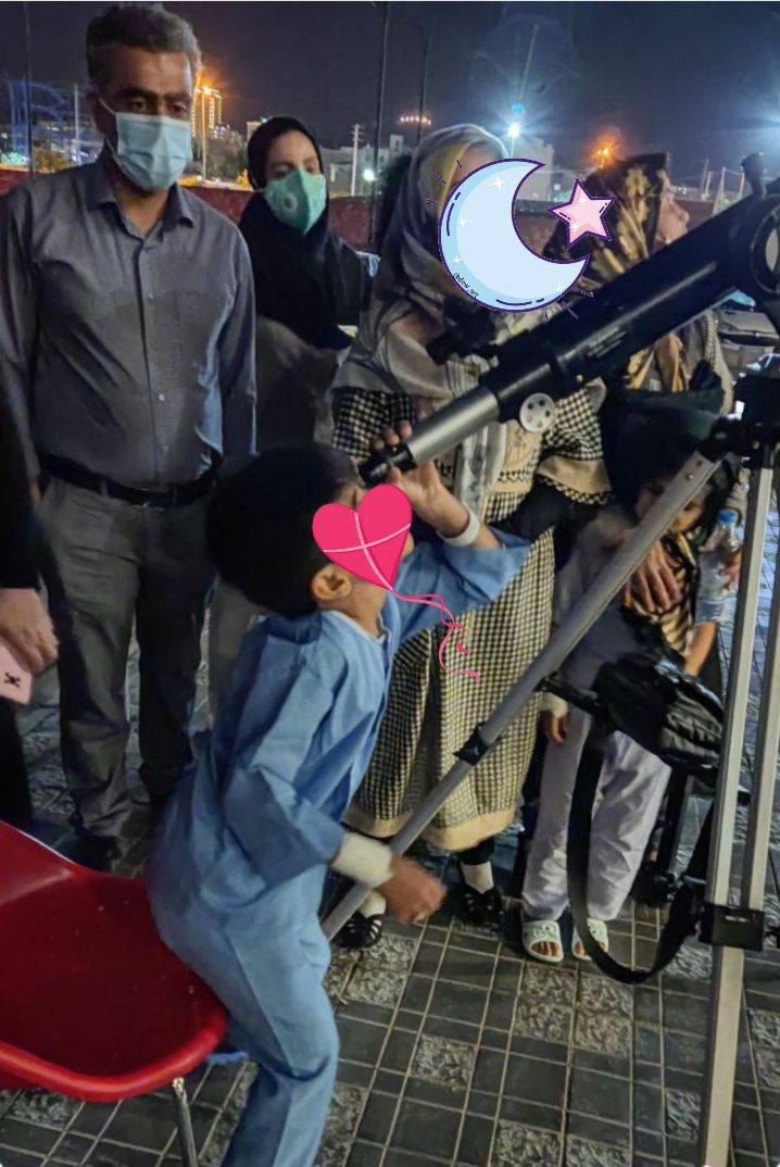 برنامه آموزشی-تفریحی به سمت ماه پریدن با مشارکت روابط عمومی بیمارستان فوق تخصصی کودکان و موسسه خیریه کودکان فرشته اند، در محوطه بیمارستان اکبر برگزار شد. پیش از شروع برنامه توضیحات آموزشی در خصوص گردش ماه و رصد ماه با تسکوپ برای کودکان بیمار انجام شد. |