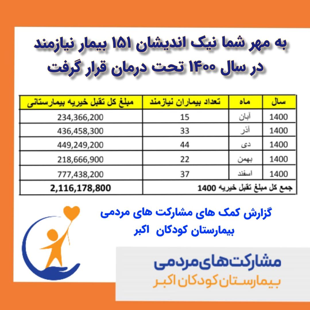 به گزارش روابط عمومی مرکز، به نقل از واحد مشارکت های مردمی بیمارستان کودکان اکبر در سال 1400 نزدیک به 151 بیمار نیازمند به کمک خیرین و نیک اندیشان تحت درمان و مداوا قرار گرفتند. شایان ذکر است واحد مشارکت های مردمی بیمارستان اکبر با مشارکت و همدلی شما نیکوکاران عزیز درصدد است با وسعت بخشیدن به خدمات خود، حمایت های بیشتری را برای بیماران نیازمند فراهم آورد. جهت کسب اطلاعات بیشتر علاقه مندان می توانند به صورت حضوری و از طریق تماس با بیمارستان اکبر واحد مشارکت های مردمی با ما در ارتباط باشند. |