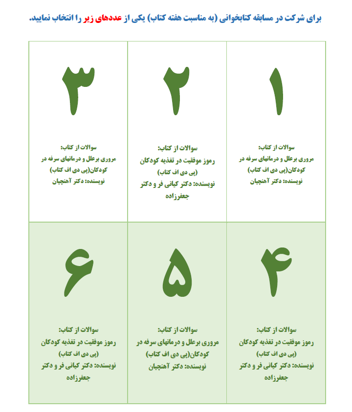 علاقه مندان برای شرکت در مسابقه کتاب خوانی می توانند یکی از سری سوالات را انتخاب و برگه پاسخ خود را به واحد کتابخانه بیمارستان یا روابط عمومی بیمارستان تحویل دهند.