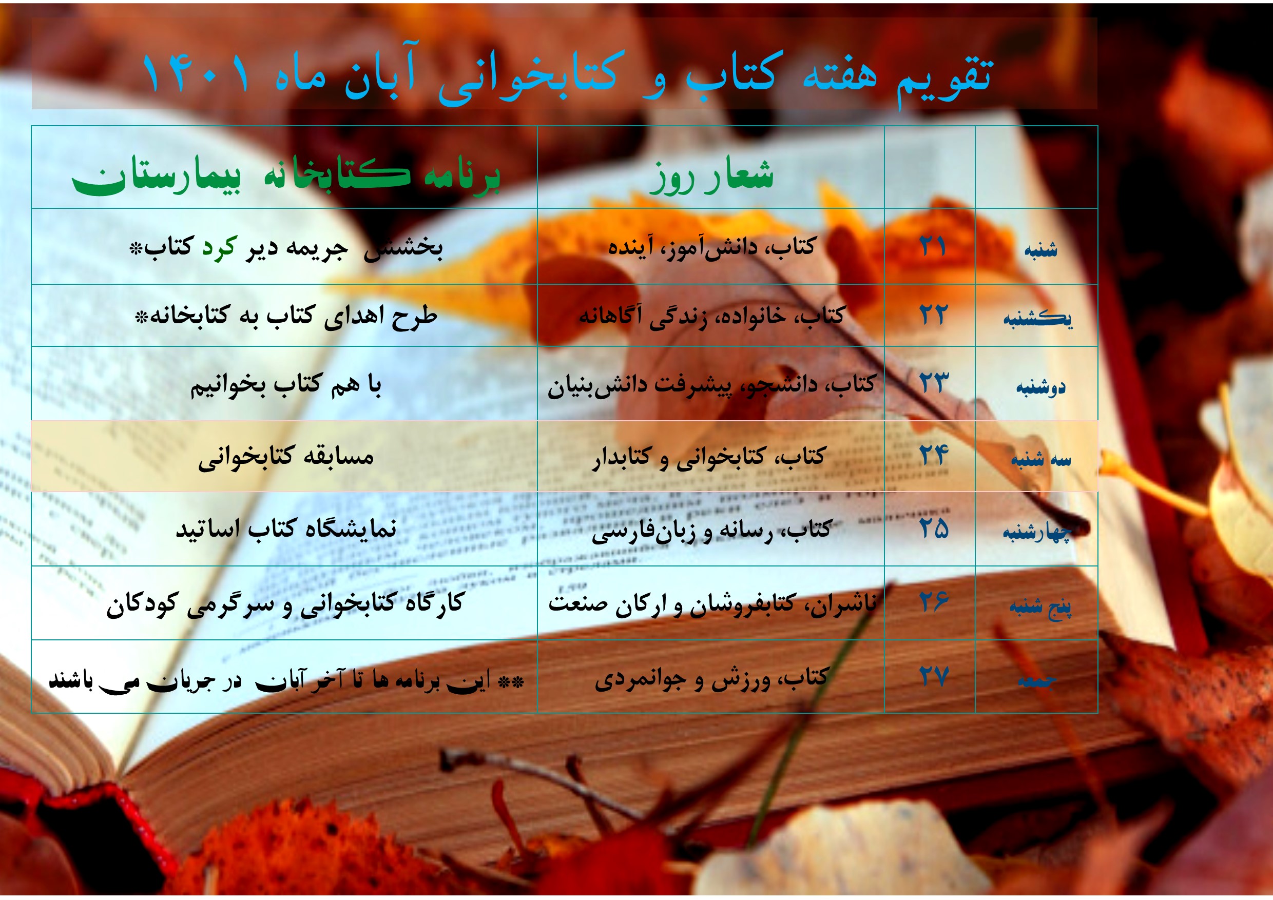1- طرح بخشش جریمه دیر کرد کتاب با اهدای کتاب. تمامی عزیزانی که از کتابخانه بیمارستان اکبر کتاب گرفته و دارای جریمه هستند به مناسبت هفته کتاب و کتابخوانی تنها با اهدای یه کتاب جدید مربوط به رشته تحصیلی پرستاری یا پزشکی کودکان تمام جرایم ایشان بخشیده خواهد شد.